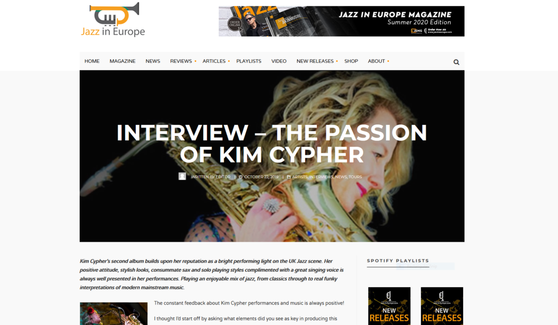 A wonderful interview in Jazz In Europe – ‘The Passion Of Kim Cypher’. “Kim Cypher’s second album builds upon her reputation as a bright performing light on the UK Jazz scene. Her positive attitude, stylish looks, consummate sax and solo playing styles complimented with a great singing voice is always well presented in her performances. Playing an enjoyable mix of jazz, from classics through to real funky interpretations of …
