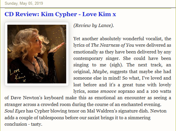 “Yet another absolutely wonderful vocalist, the lyrics delivered as emotionally as they have been delivered by any contemporary singer. The game is afoot!” Lance Liddle – Bebop …