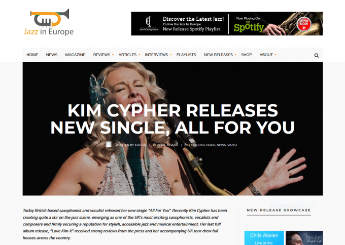 My thanks to Jazz In Europe for featuring my new release track ‘All For You’ on their website and new release Spotify playlist: Kim Cypher releases new …